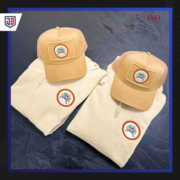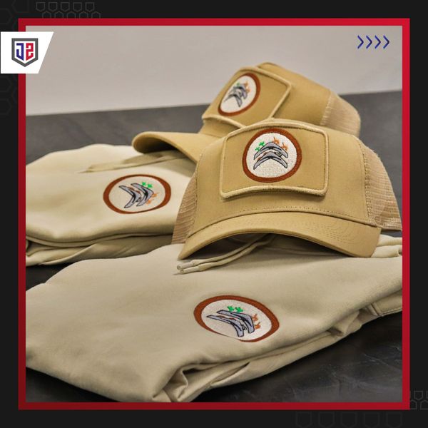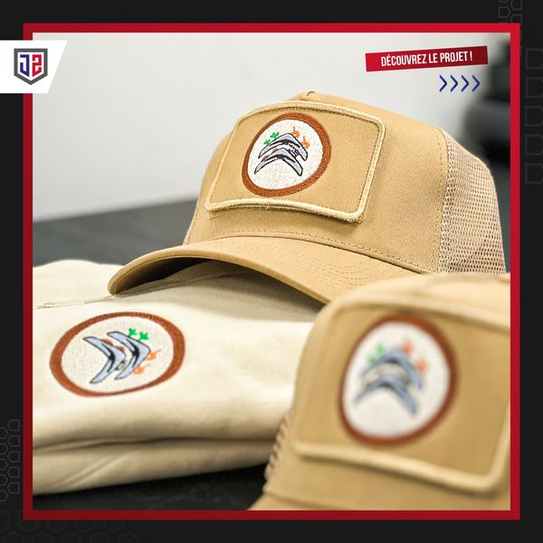 Fourniture des textiles, broderie du logo sur le cœur des sweats et patch brodé sur les casquettes — un combo parfait pour affronter la poussière des pistes avec élégance.